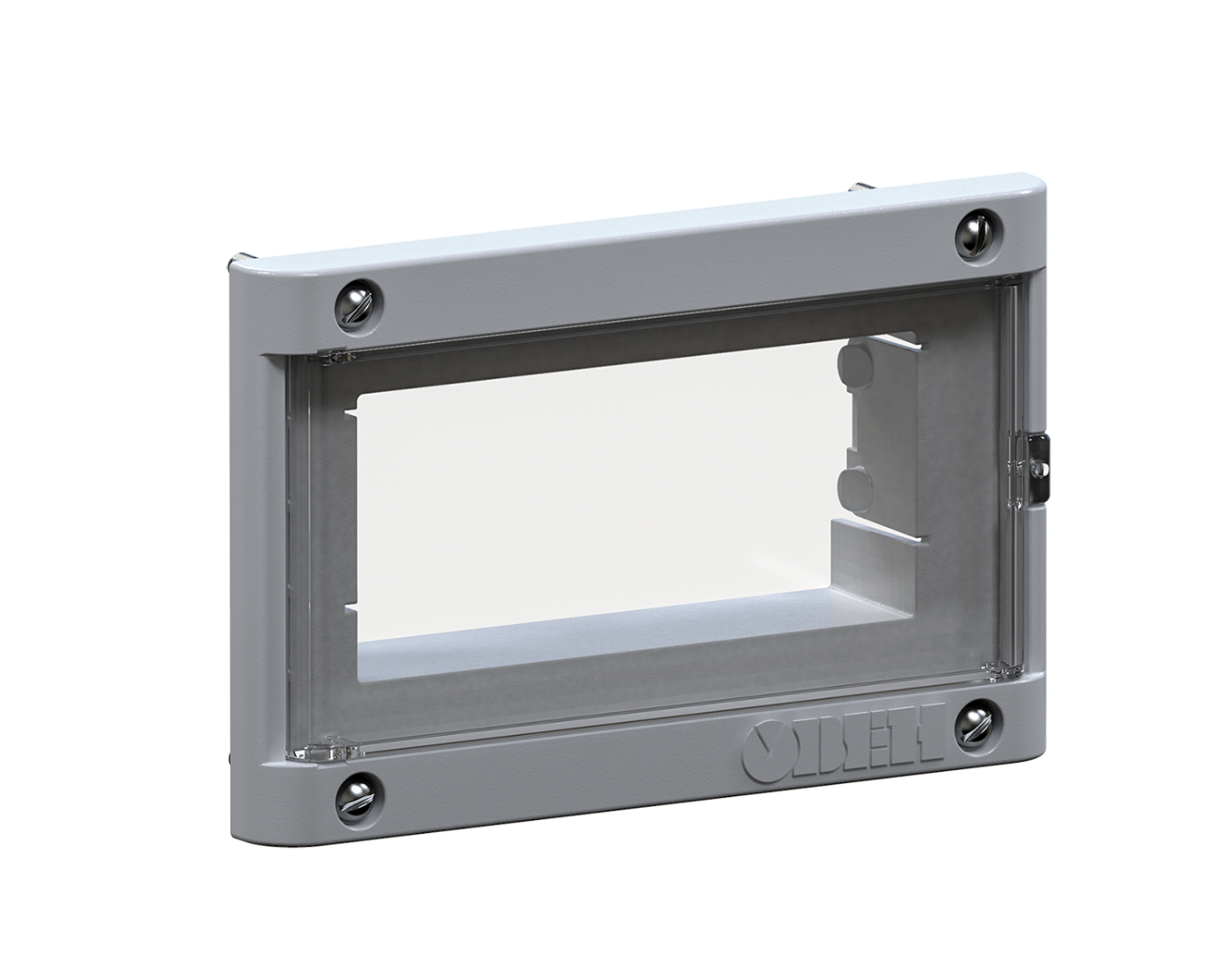 Конструкция рамки содержит прозрачную дверцу, которая может открываться на угол до 100 градусов и фиксироваться в открытом положении. Прозрачная дверца осуществляет дополнительную защиту приборов от внешних механических воздействий, защищает лицевую панель от попадания брызг, загрязнений, значительно увеличивает срок службы гибко-пленочной клавиатуры прибора. В конструкции рамки имеются встроенные крепежи для установки прибора.