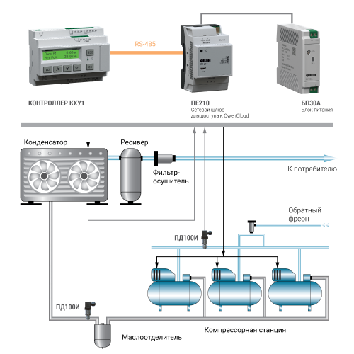 КХУ1 – это специализированный контроллер с готовым алгоритмом для управления холодильными централями. Прибор регулирует давление испарения и конденсации, обеспечивая круговой прогон хладагента. Применяется для обеспечения охлаждения в химической, фармацевтической, пищевой и перерабатывающей промышленности.