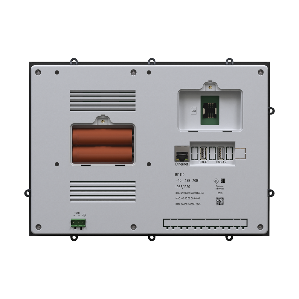 Корпус web-панели ВП110 с лицевой стороны защищен от пыли и влаги, степень защиты – IP65. Глянцевая поверхность лицевой стороны легко очищается. ВП110 имеет щитовое крепление и возможность крепежа по стандарту VESA100.