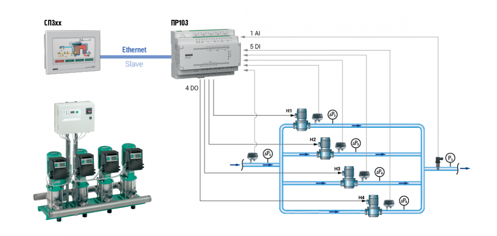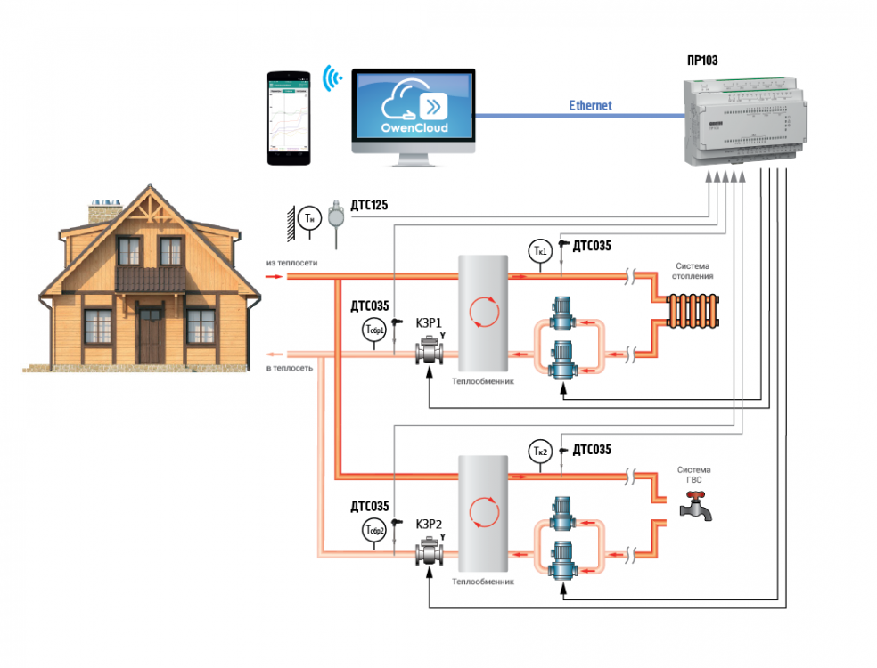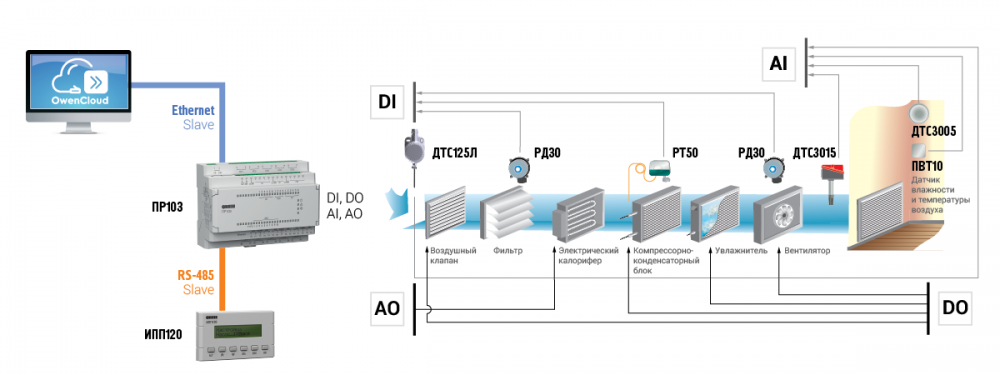ПР103 – это первое программируемое реле с Ethernet на борту. Предназначено для управления вентиляцией, отоплением, насосными группами и другим оборудованием. Наличие интерфейса Ethernet позволяет осуществить прямой доступ к сервису OwenCloud и реализовать управление оборудованием из любой точки мира. В ПР103 может быть до 2-х интерфейсов RS-485 на борту для передачи данных на верхний уровень. В корпусе 7DIN располагается до 34 аналоговых и дискретных входов/выходов.