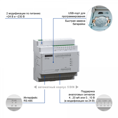 Прибор изготавливается в автоматном корпусе 5 DIN. Имеет на борту аналоговые и дискретные входы, а также дискретные выходы. Для управления устройствами по сети или передачи данных на верхний уровень в приборе предусмотрен интерфейс RS-485.