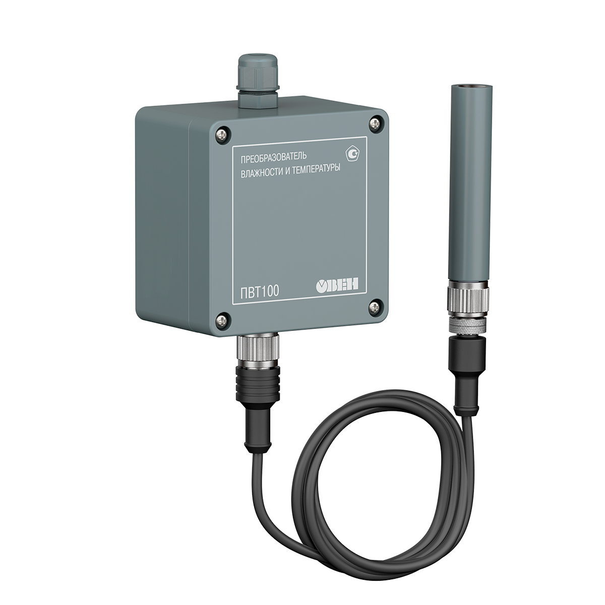 Модель ПВТ100-Н4 является наиболее универсальной и распространённой модификацией, подходит для большинства применений. Данная модель предназначена для установки на стену. Преобразователь оснащен быстросъемным зондом, который подключается к базе через интерфейс M12. Датчик измеряет температуру от -40…+80 ⁰С и относительную влажность от 0...100 %RH.